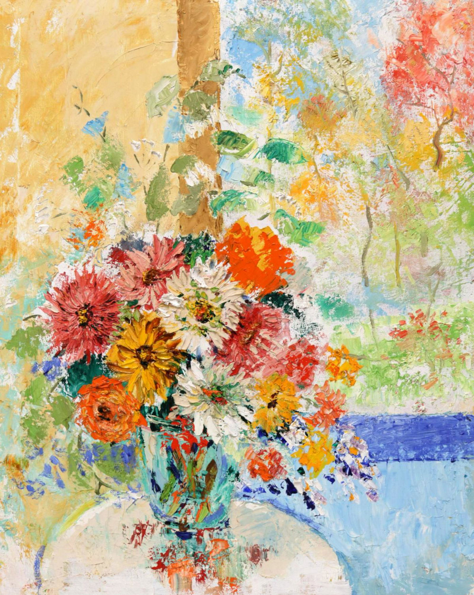 Vintage Chinese Motif Still Life Oil Painting Flowers Confucius Signed Mid Century Modern Asian