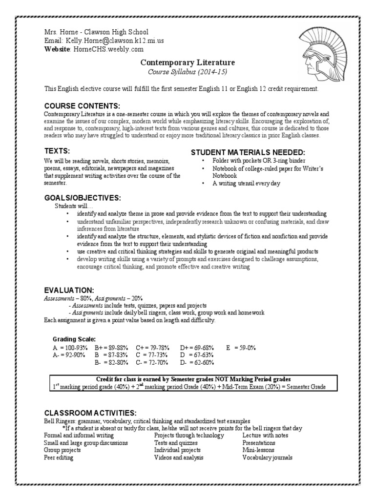 Contemp Lit Syllabus 2015 Homework Test Assessment