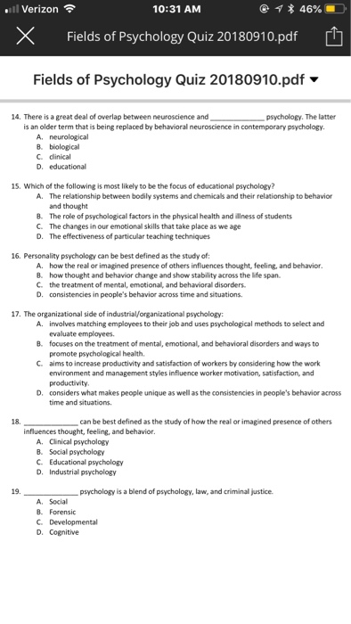 Solved 11 Verizon 10 31 Am Fields Of Psychology Quiz 201